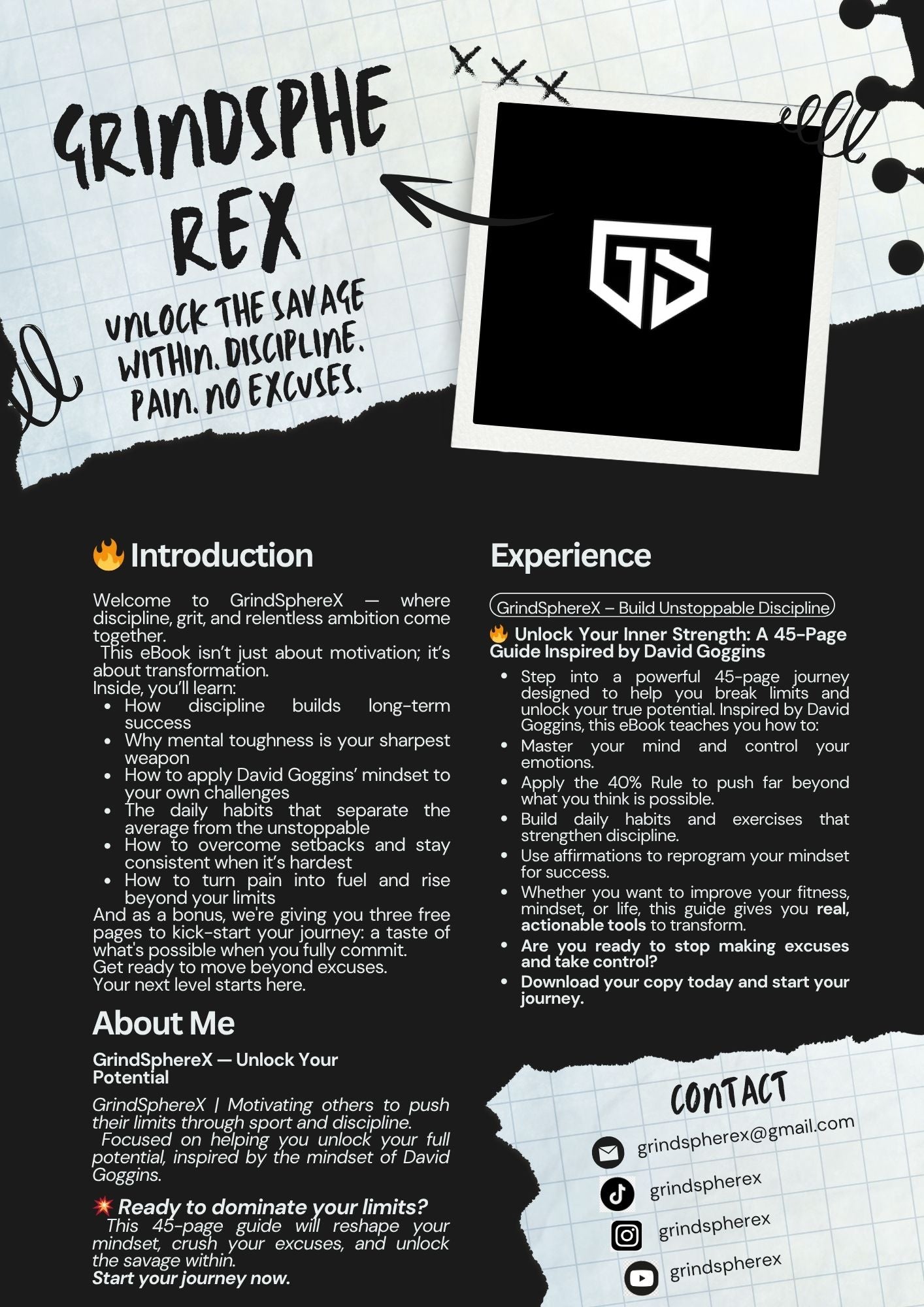 The GrindSphereX 45‑Page Discipline Guide is your no‑excuses weapon for peak performance. Inside you'll discover the structured mindset tactics, daily discipline drills, and mental toughness frameworks to resist comfort and push further—every single day. No fluff, no filler—just real tools to rewire your focus, eliminate weak habits, and unleash your inner savage.